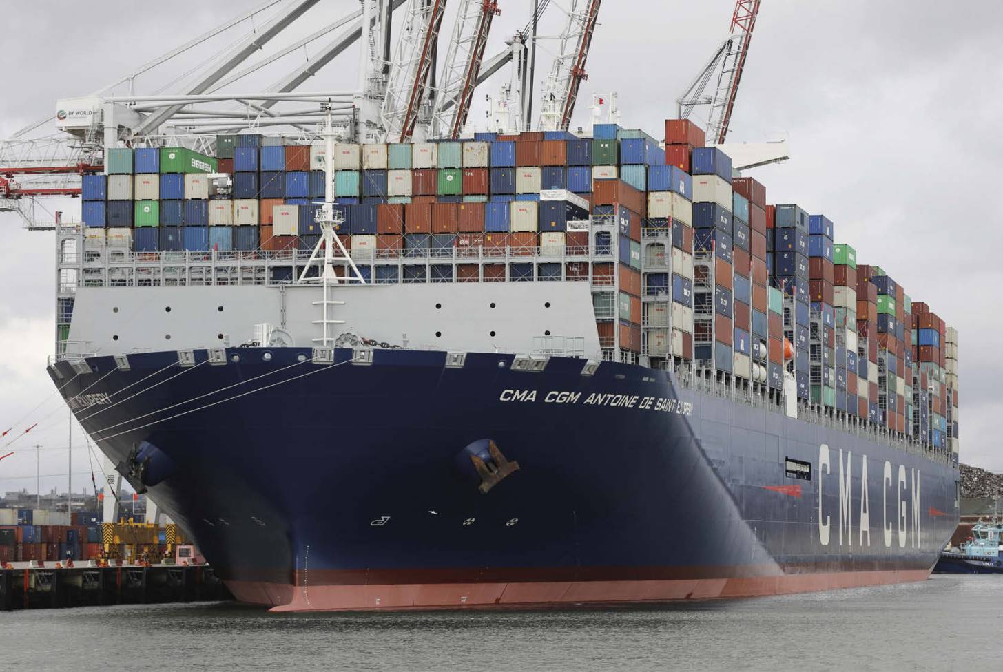 A portion of Britain’s seaborne trade on CMA CGM Antoine de Saint Exupery at Southampton docks. The French-flagged vessel is the largest container ship based in Europe.